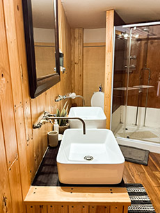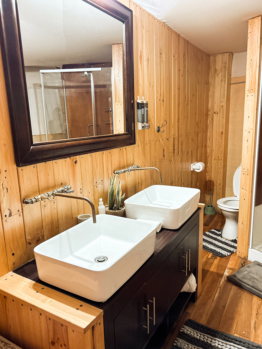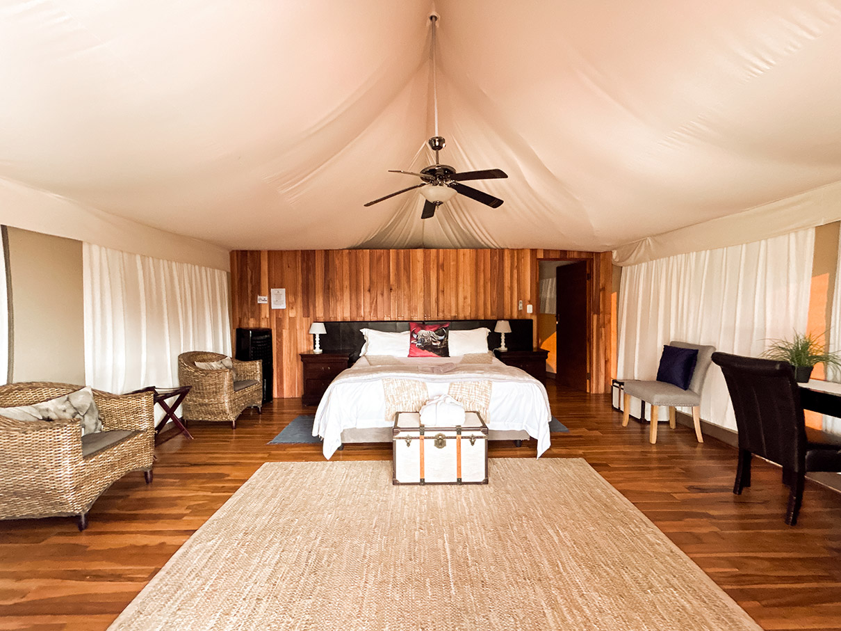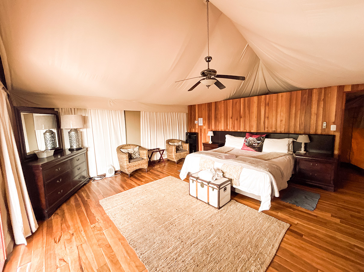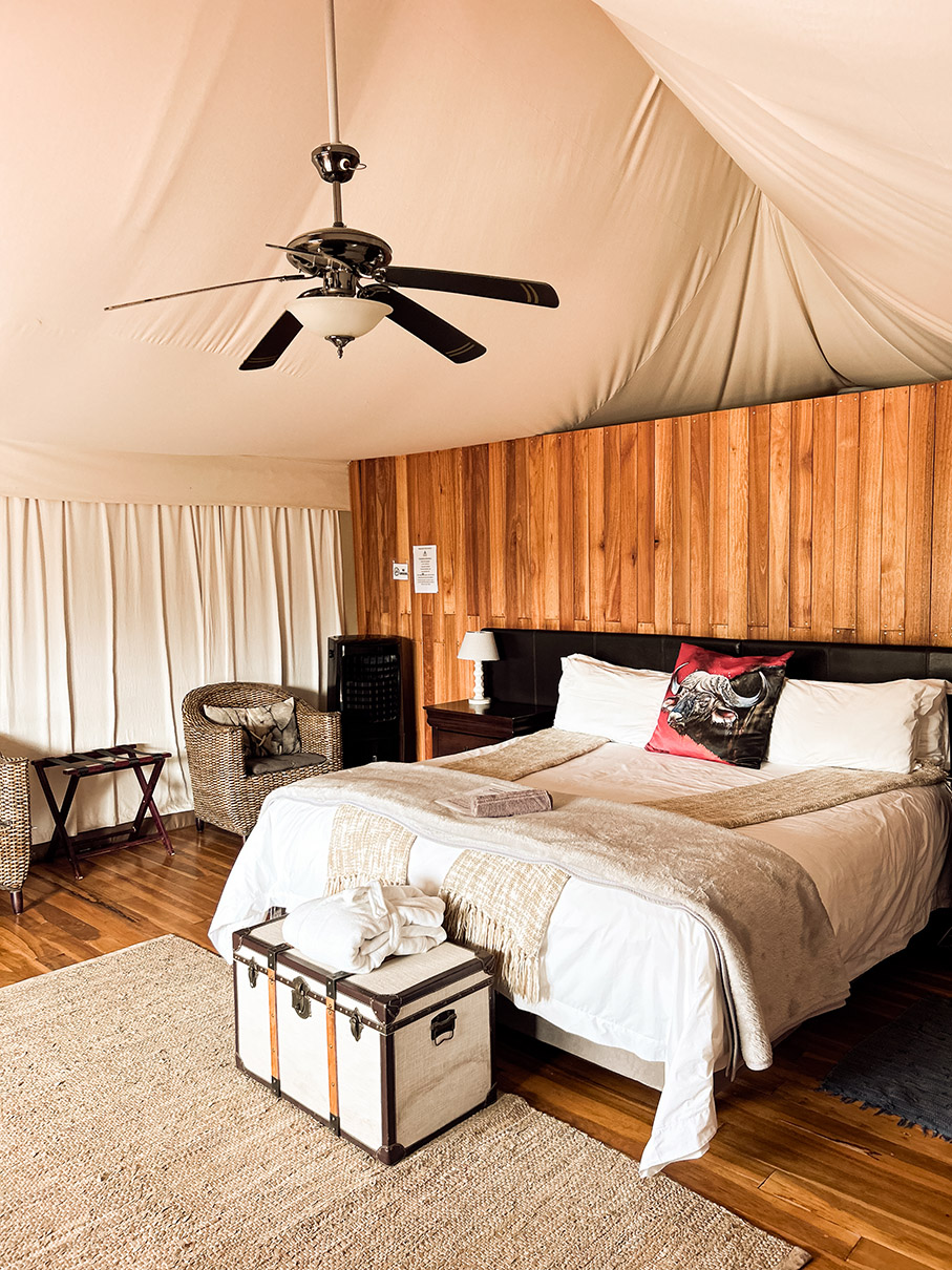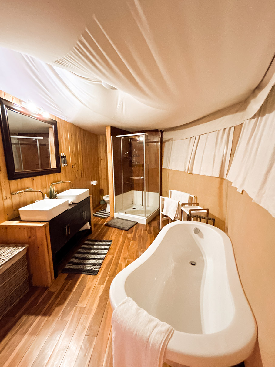 Surrounded by the peaceful outdoors, this spacious sanctuary features a king-size bed dressed in crisp white linens, layered with soft neutral-toned blankets and a charming accent pillow. A wood-paneled headboard and vintage trunk add a touch of lodge-inspired warmth, while thoughtful amenities like ambient bedside lighting, a ceiling fan, and cushioned wicker chairs create a cozy, stylish retreat. With its blend of natural textures and sophisticated details, this glamping experience offers the perfect setting to relax, recharge, and enjoy the tranquility of the landscape.